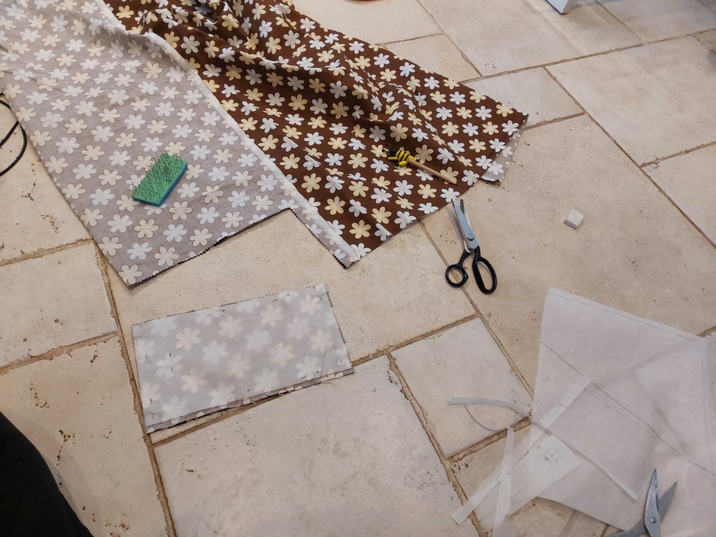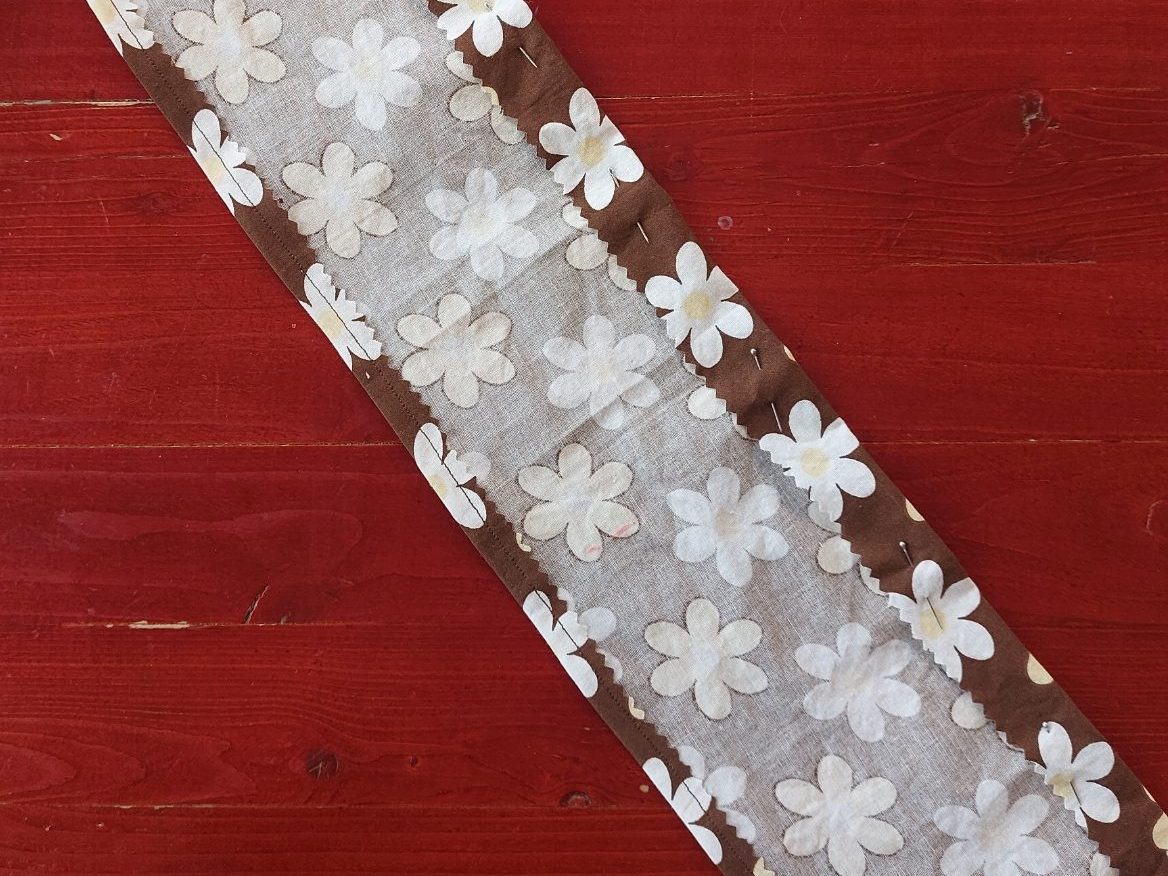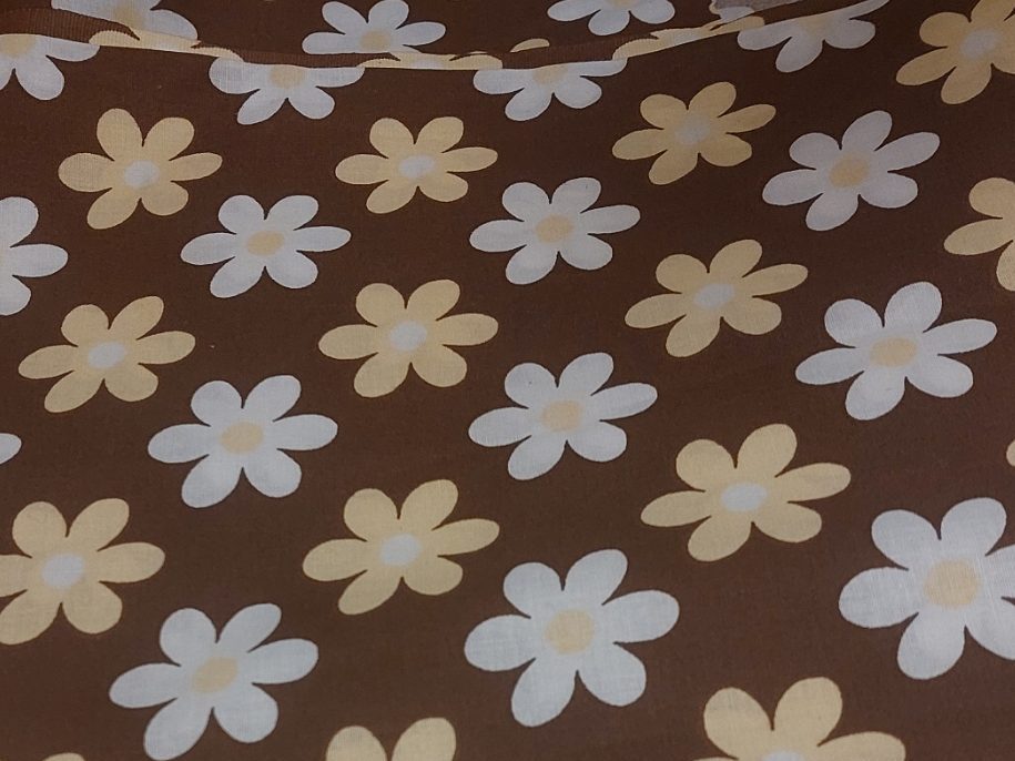 My new and first fabric is a dark brown material with light yellow and white flowers.