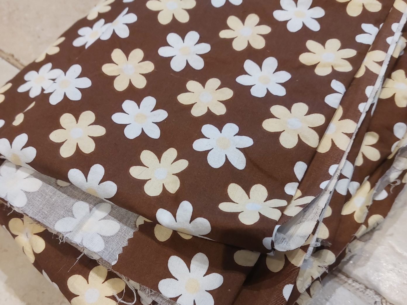- A relatively hard, absolutely stunningly beautiful flowery cotton material. From this beauty, I’ll sew myself a dress.