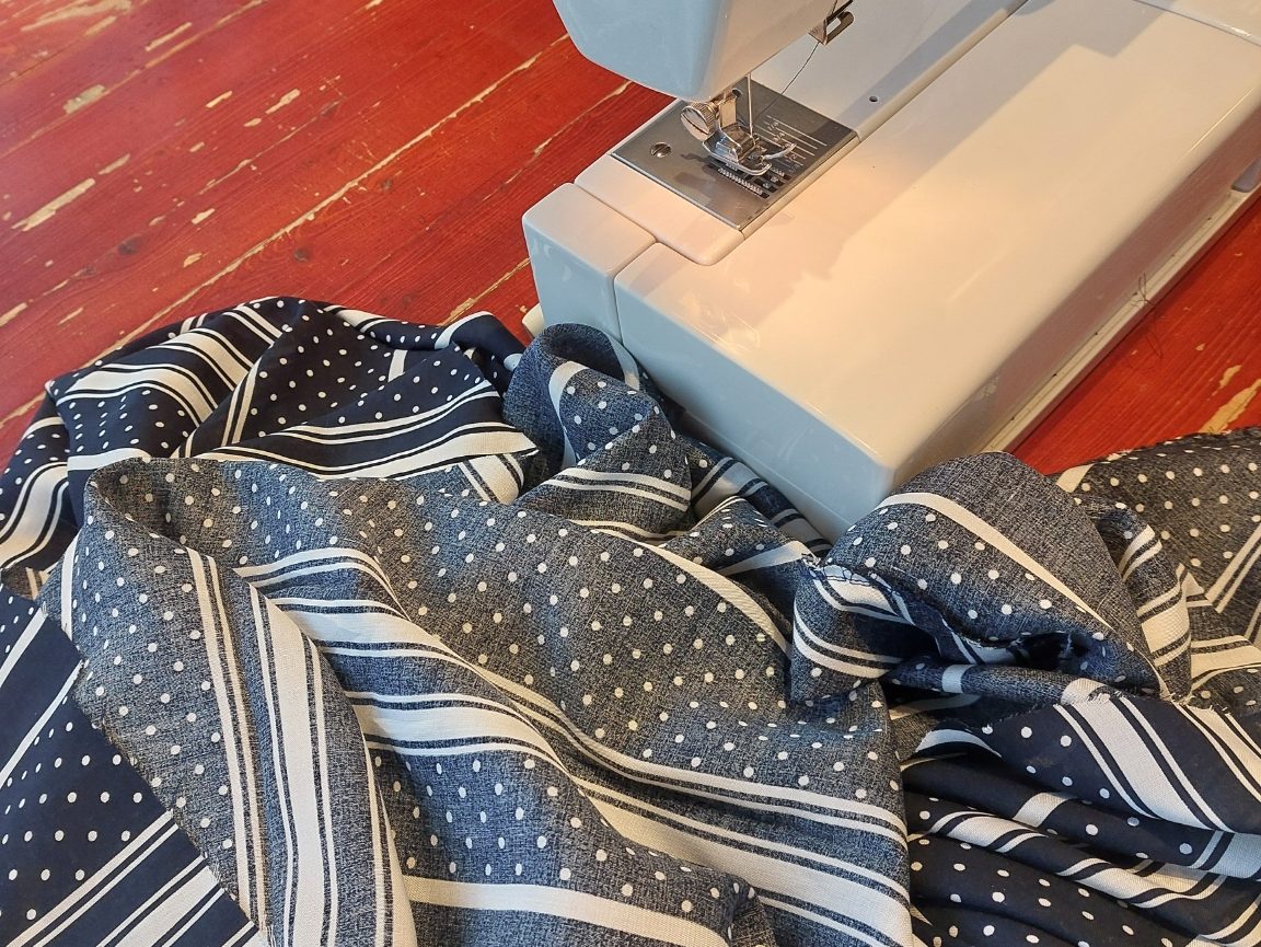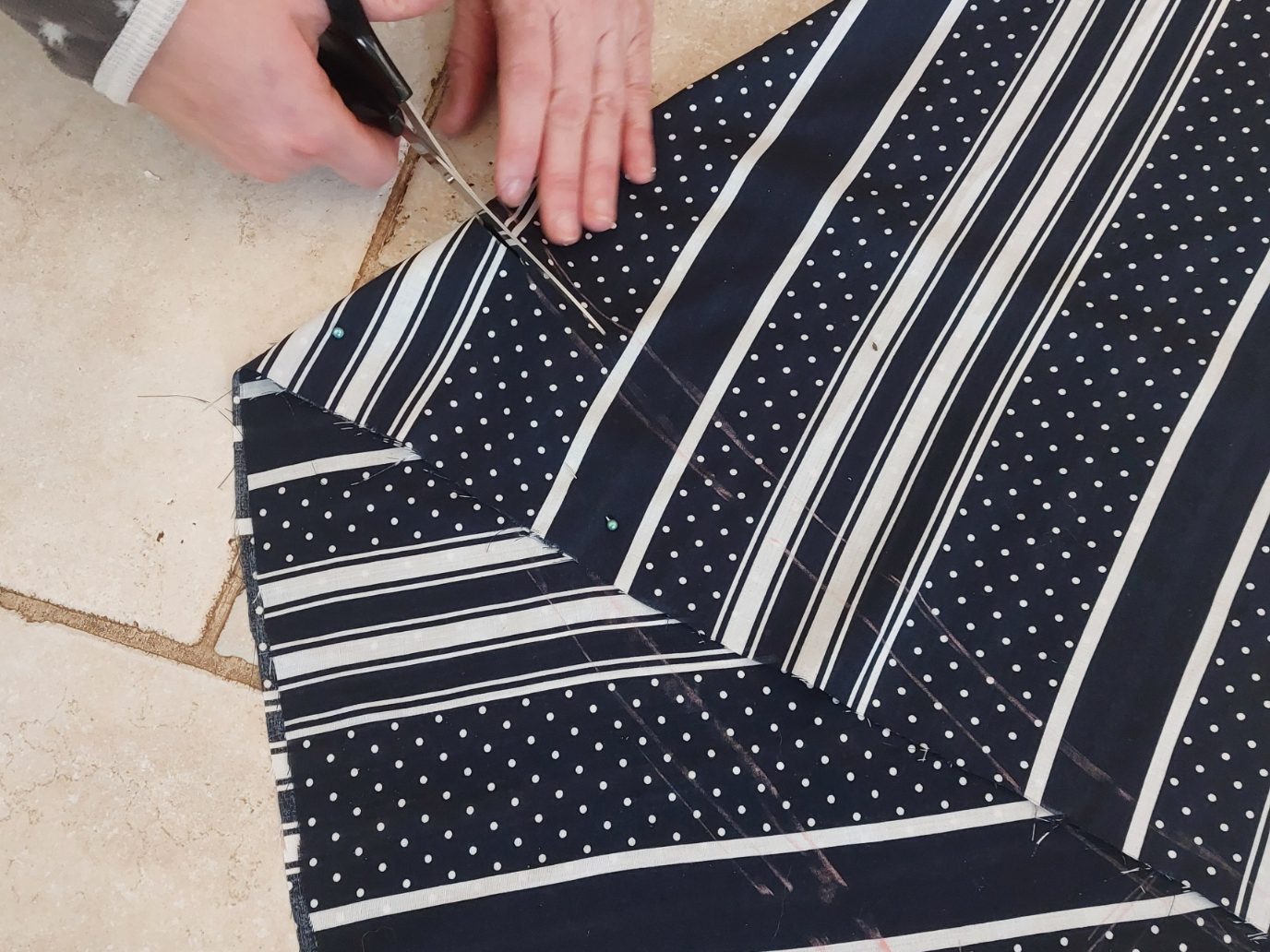 We pinned the cut-out material together to picture how the skirt would look like. We wanted a 360° skirt. Given that our material wasn’t wide enough, we couldn’t cut it out as one big circle. We had to improvise, and we put the big piece together from three smaller pieces to make it a whole.